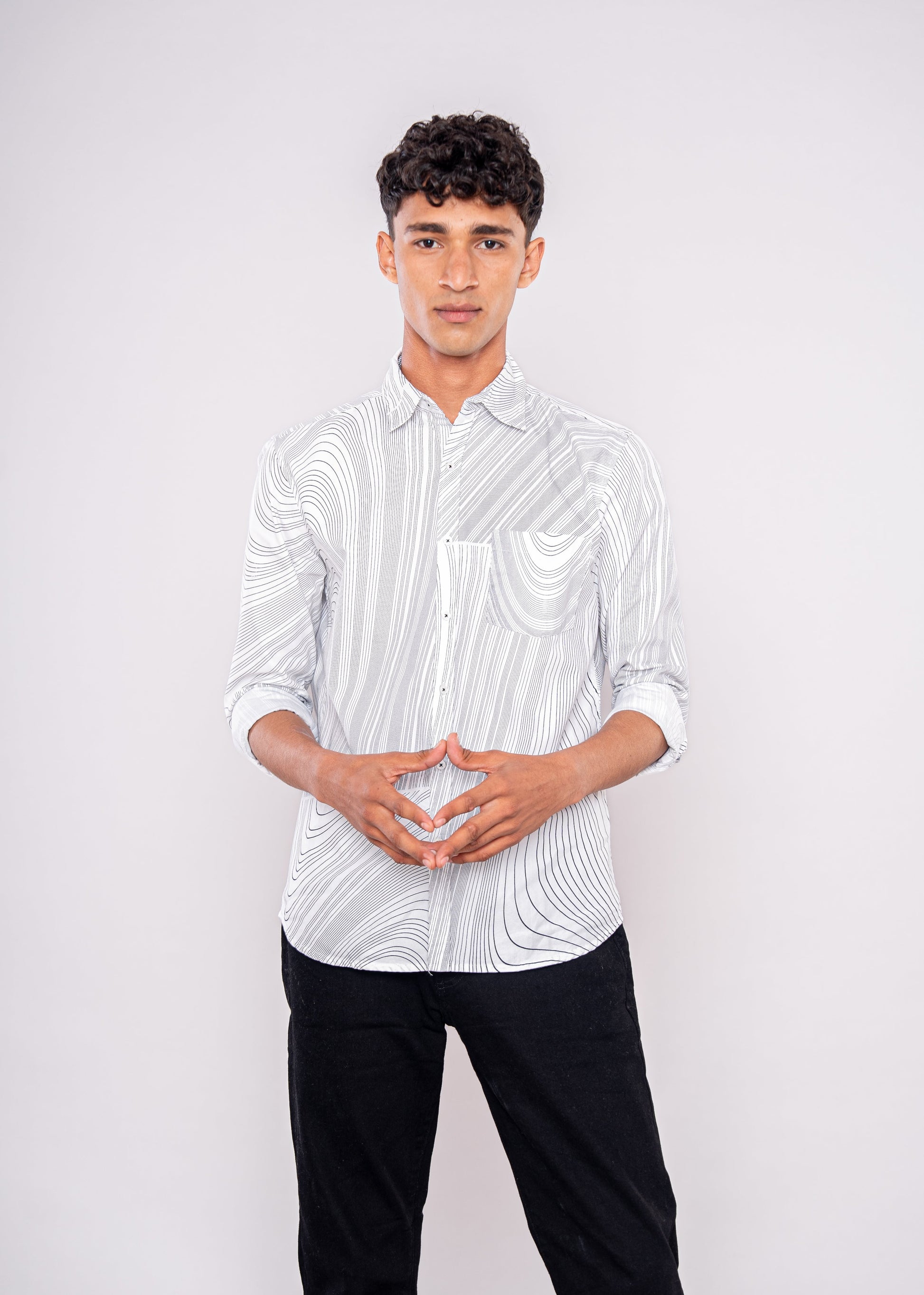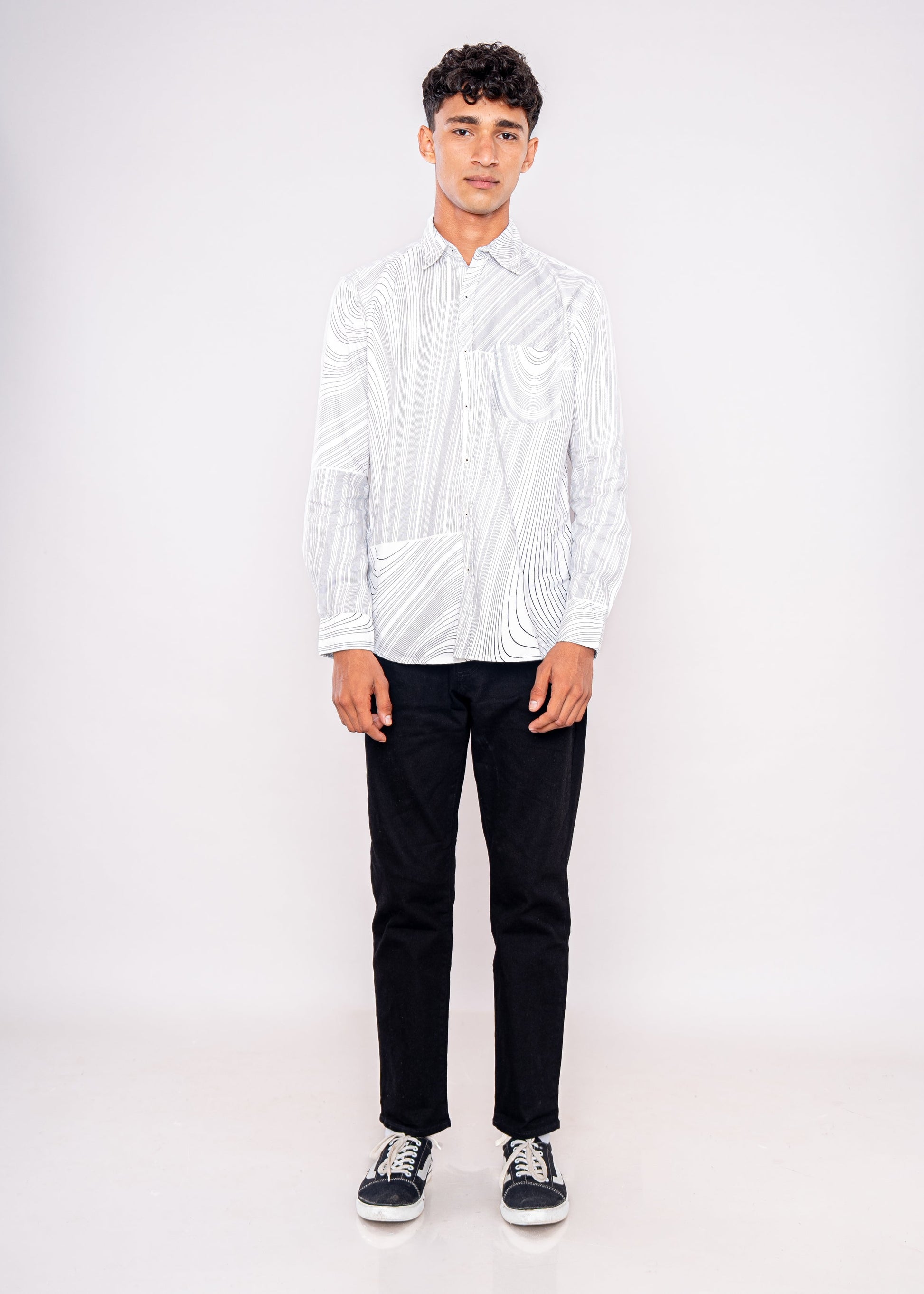 Make a statement with this abstract printed shirt β pair it with solid chinos or denim to let the bold print stand out. Add sneakers for a casual look.